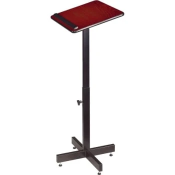 - Practical, affordable and convenient speaker stand lectern has an application in every venue. Black 16-gauge steel base height adjusts 30” – 44” to suit any speaker. Generous 16” x 20” reading surface for presentation materials. Features T-mold edging and helpful rubber paper/book stop. Easy assembly.