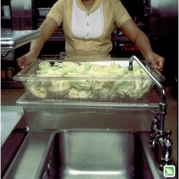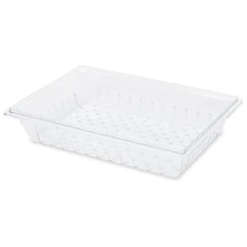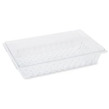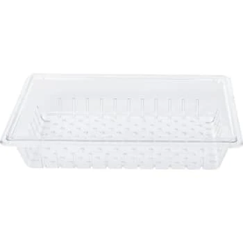 - Rubbermaid 3303 colander / drain tray fits full-size food storage boxes and reduces food spoilage costs. Its clear, break-resistant co-polyester material allows for product visibility and easy cleaning. Great for marinating foods or thawing foods, it drains fresh fish, vegetables, and chicken in a quick and effective manner.